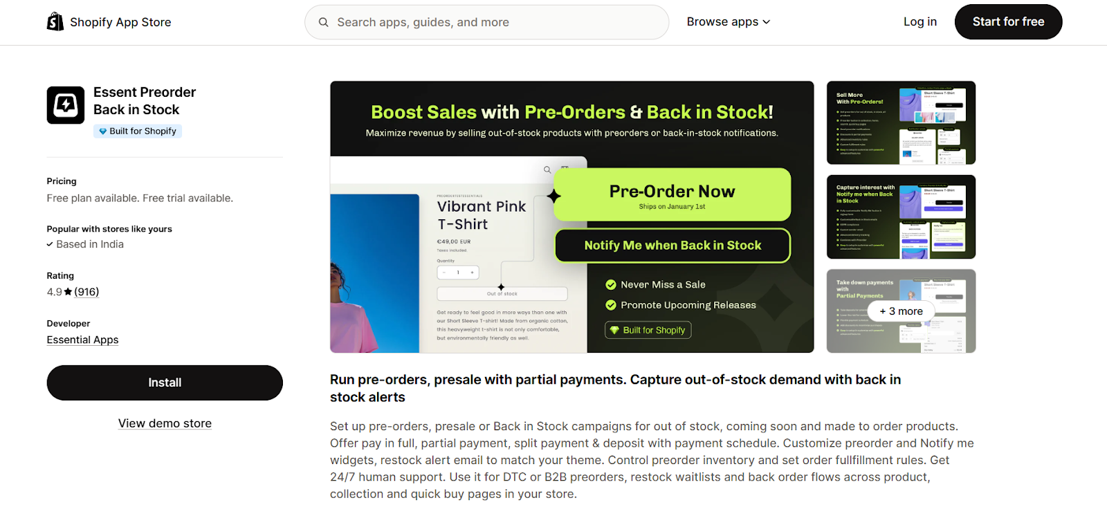 Essent is a Shopify backorder app with theme customization options for merchants. The app handles email notifications with stylish widgets. Apart from backorders, it also has other robust features like preorders, and partial payments.