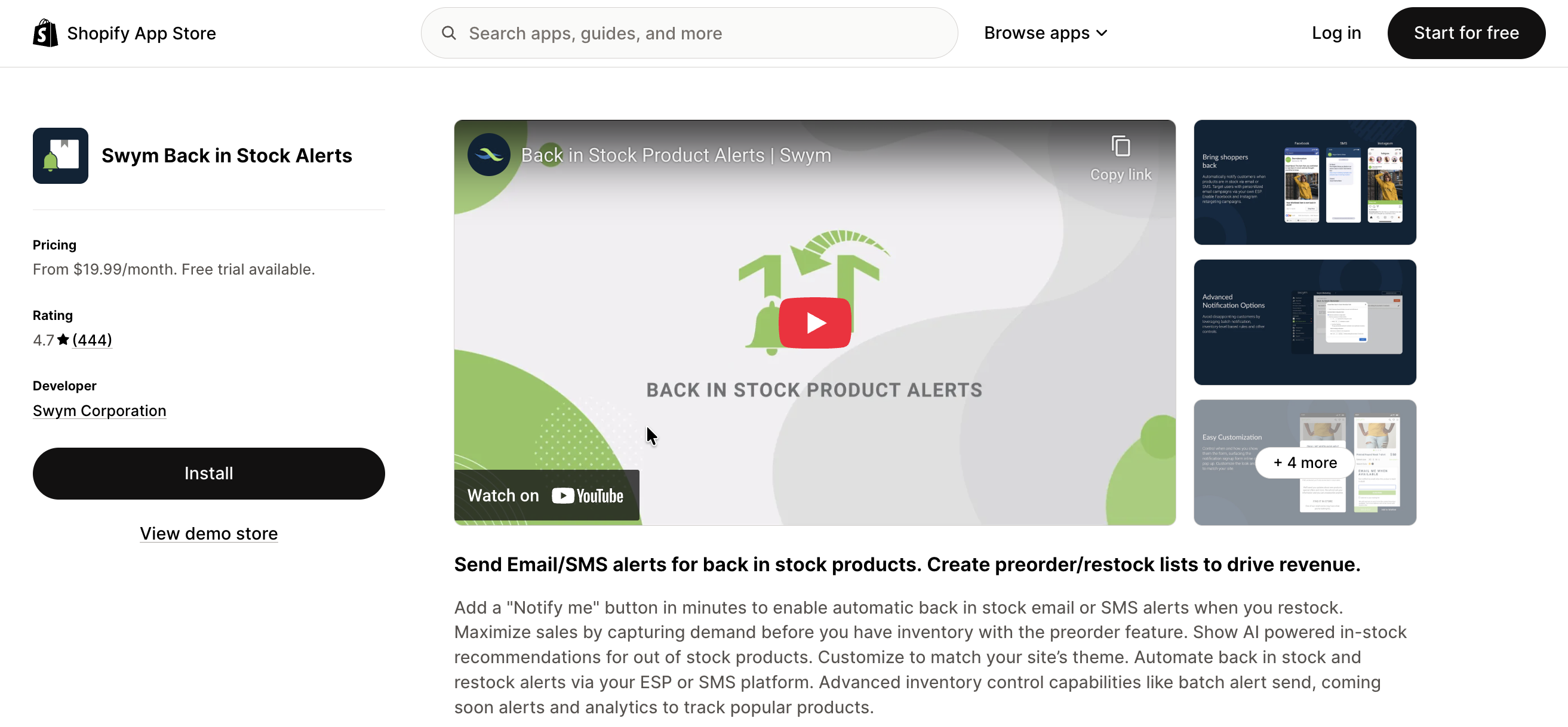 Swym handles back-in-stock notifications with quick setup. There are integration options for merchants who use multiple marketing platforms. Merchants can get alerts running in minutes with automatic theme integration. The app also includes AI-powered product recommendations for out of stock items.