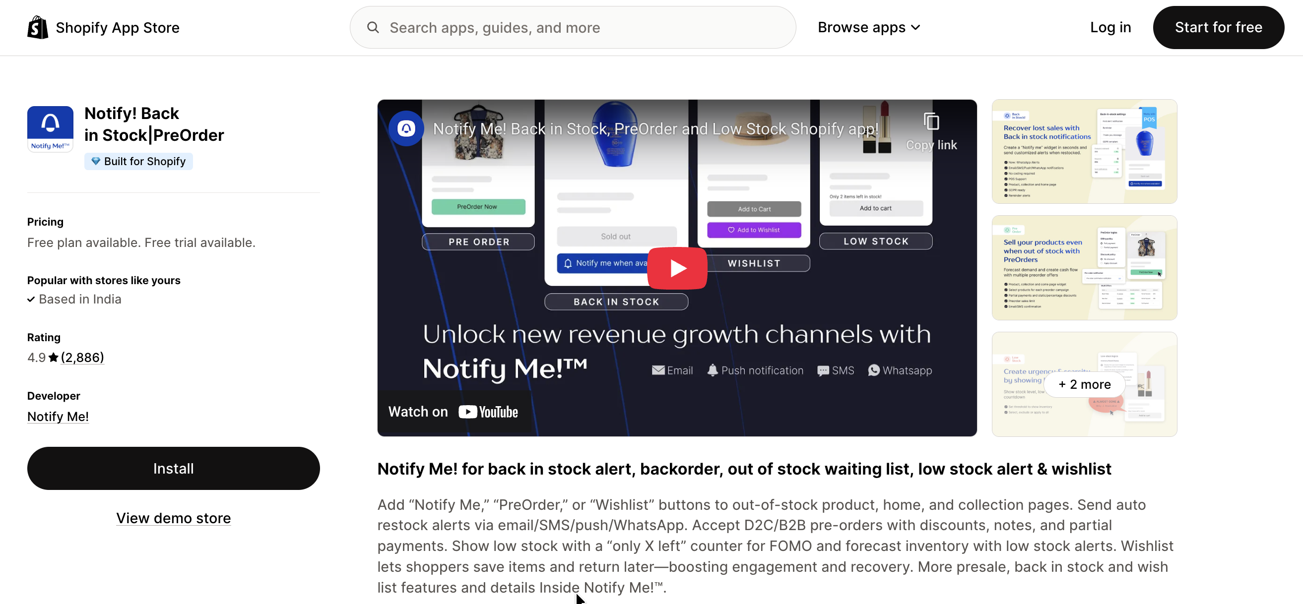 Notify Me specializes in back-in-stock notifications with a focus on customer engagement. The app provides automated alerts when products return to inventory.