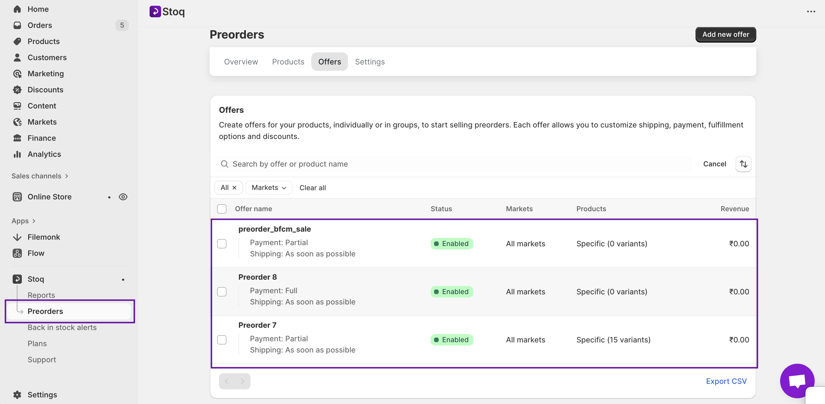 From your STOQ dashboard, go to Preorders, open an existing offer, and switch to the Payment tab.