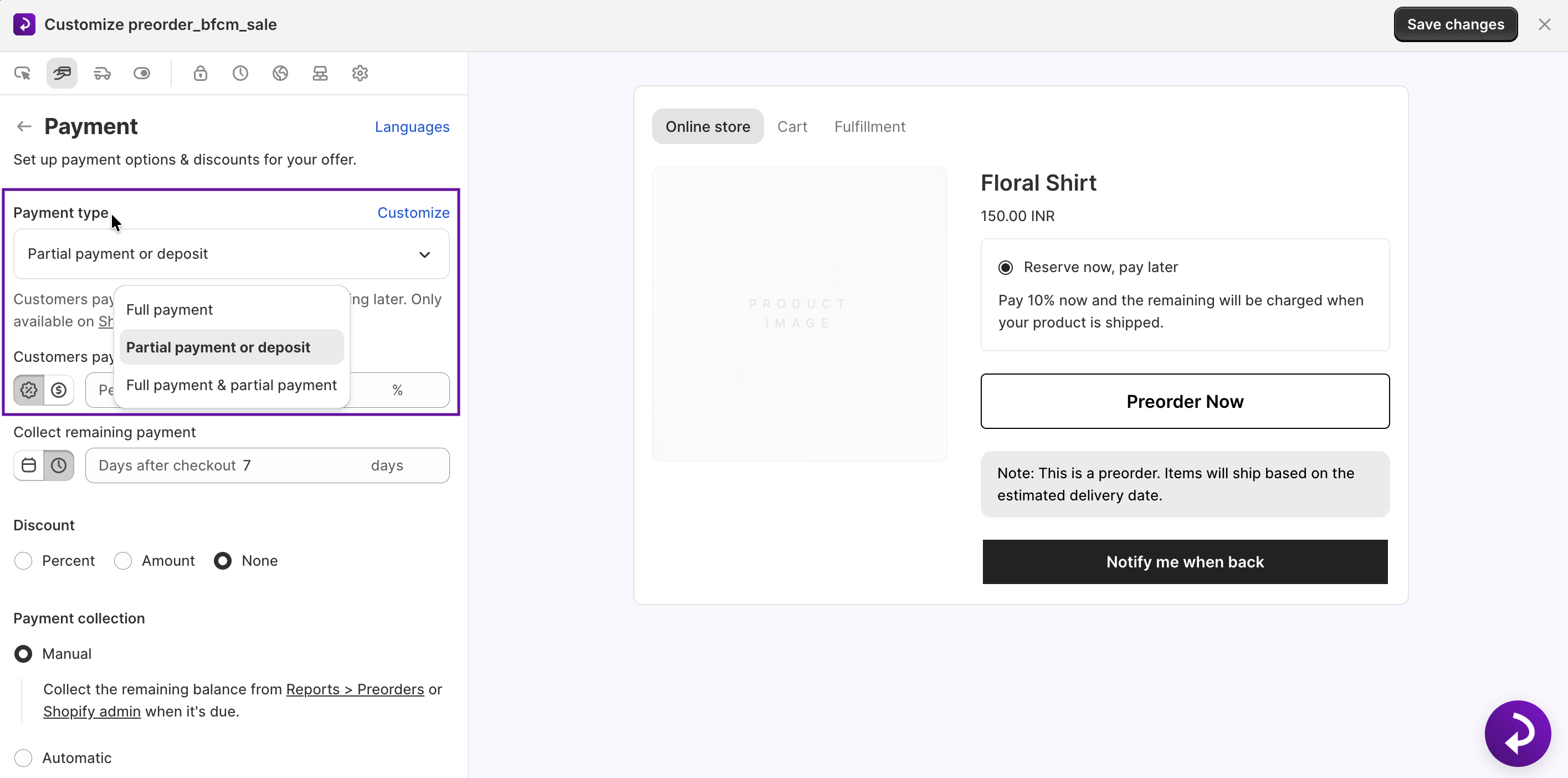 Preorder payments come in two forms: partial payments (where you collect a deposit upfront and the balance later) or deferred payments (where you authorize the full amount but only capture funds when the product ships).