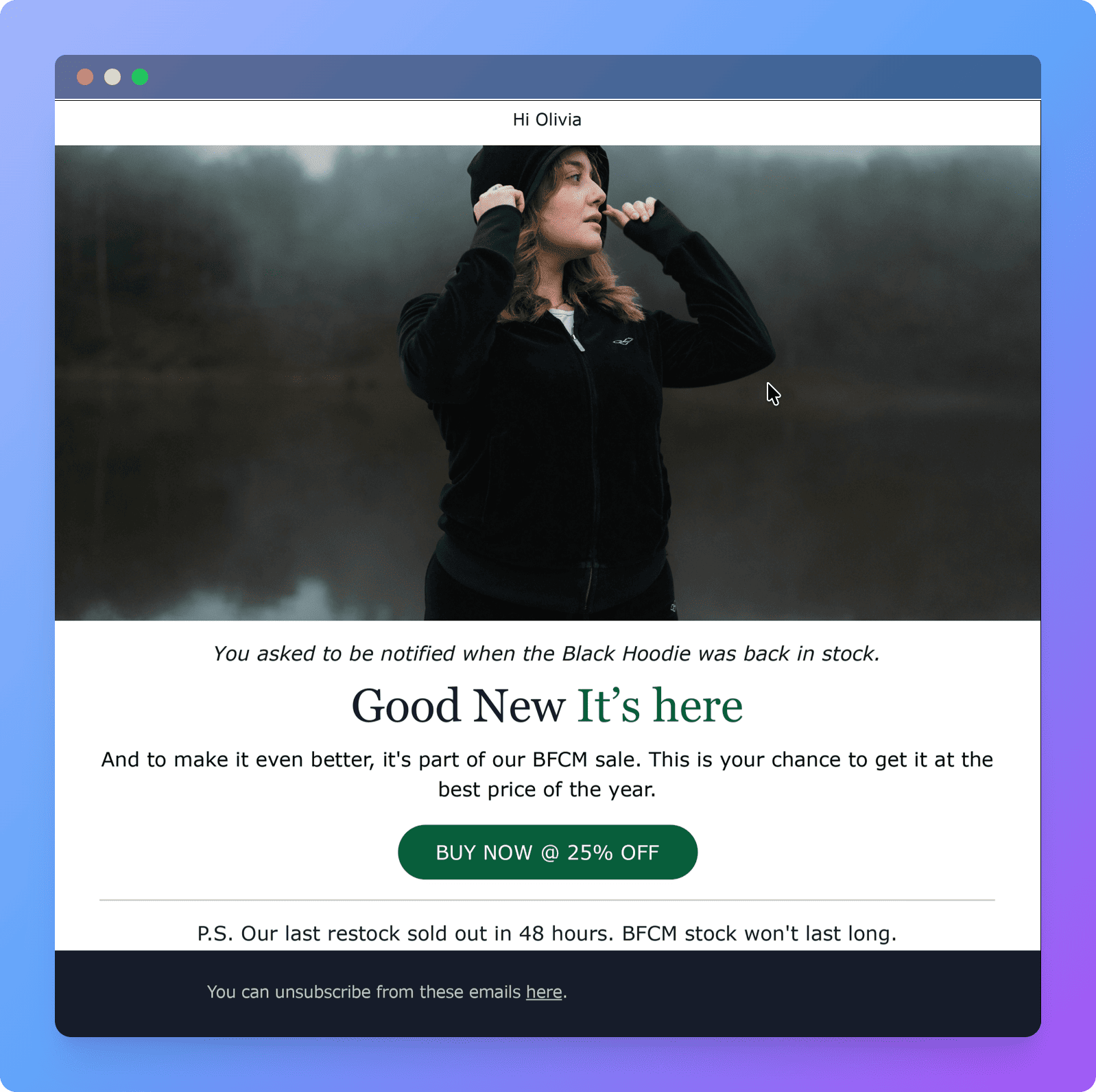 - New subscribers: Welcome them to your shopping experience with a first purchase incentive related to BFCM and current promotions